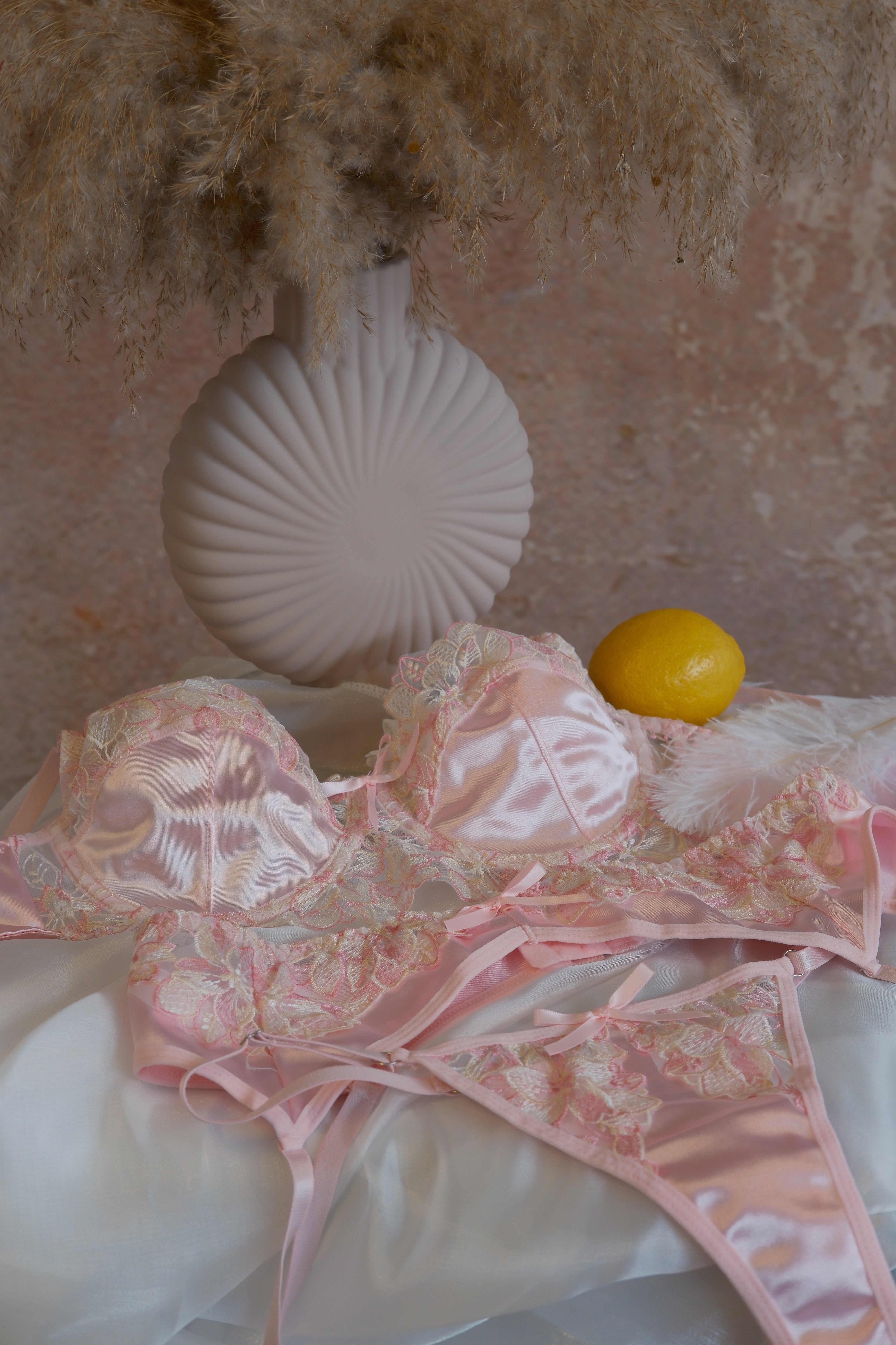 Its soft pink satin base adorned with delicate white and pink floral embroidery evokes the gentle beauty of cherry blossoms. The set is embellished with sweet bows, adding a touch of whimsy and femininity.