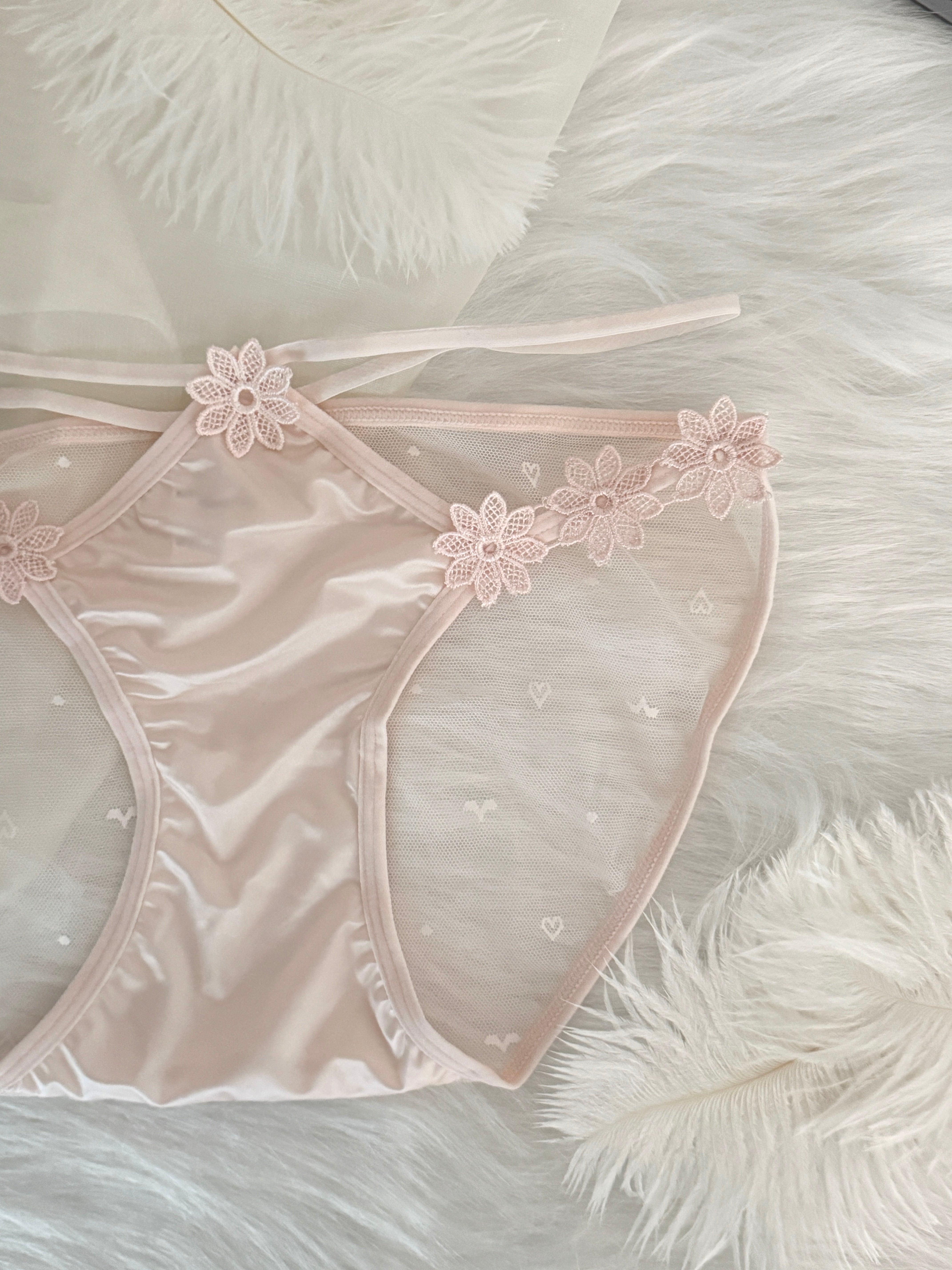 Its soft pink fabric and gentle white floral lace appliques create a subtle and elegant design. The sheer panels adorned with tiny hearts add a whimsical touch, making it a perfect blend of romance and sophistication.