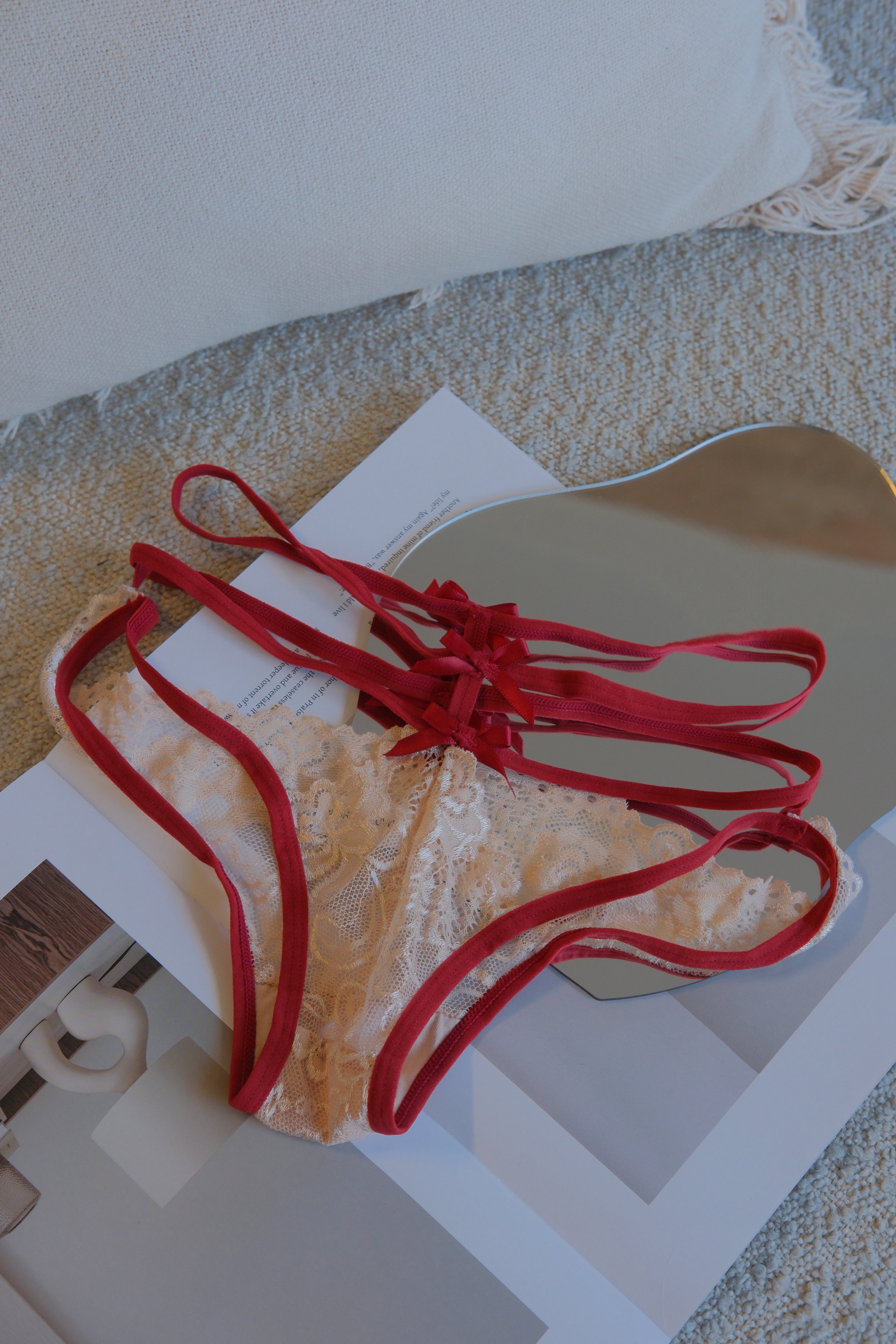 With hand crafted, Crimson Red is a sophisticated and alluring choice. The intricate black lace, delicate mesh, and striking crimson satin ribbons create an elegant and bold design.