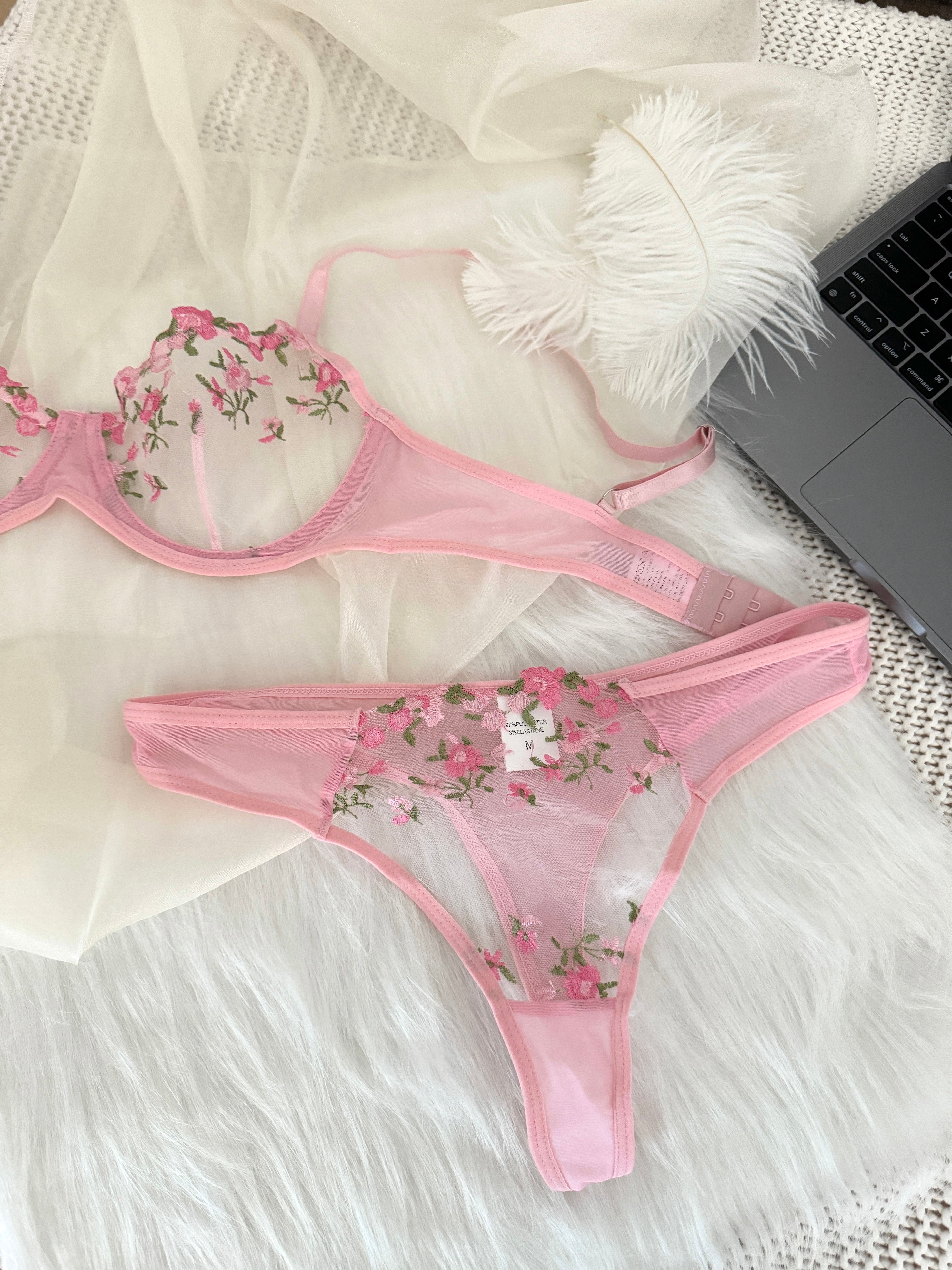 This set features intricate rose embroidery on sheer mesh fabric, creating a soft, romantic look that’s both playful and alluring. The light pink tones, coupled with the floral lace, evoke a sense of blooming petals, adding a touch of nature’s grace to your lingerie collection.